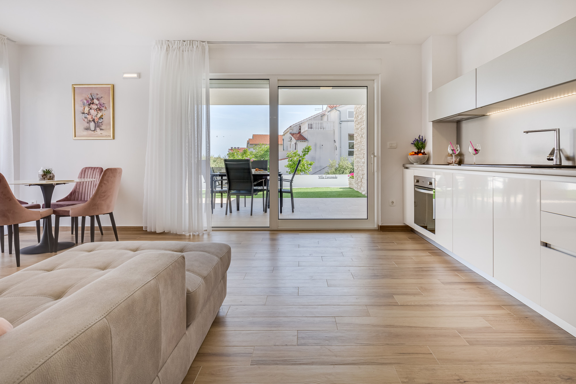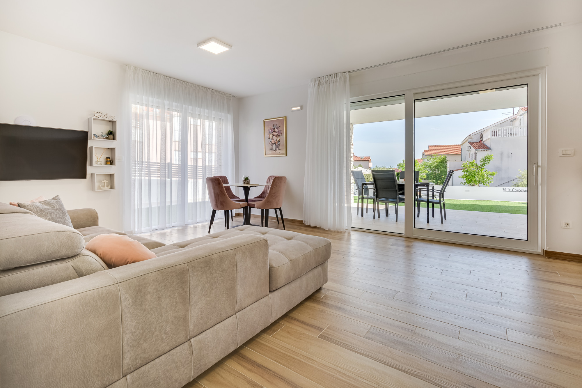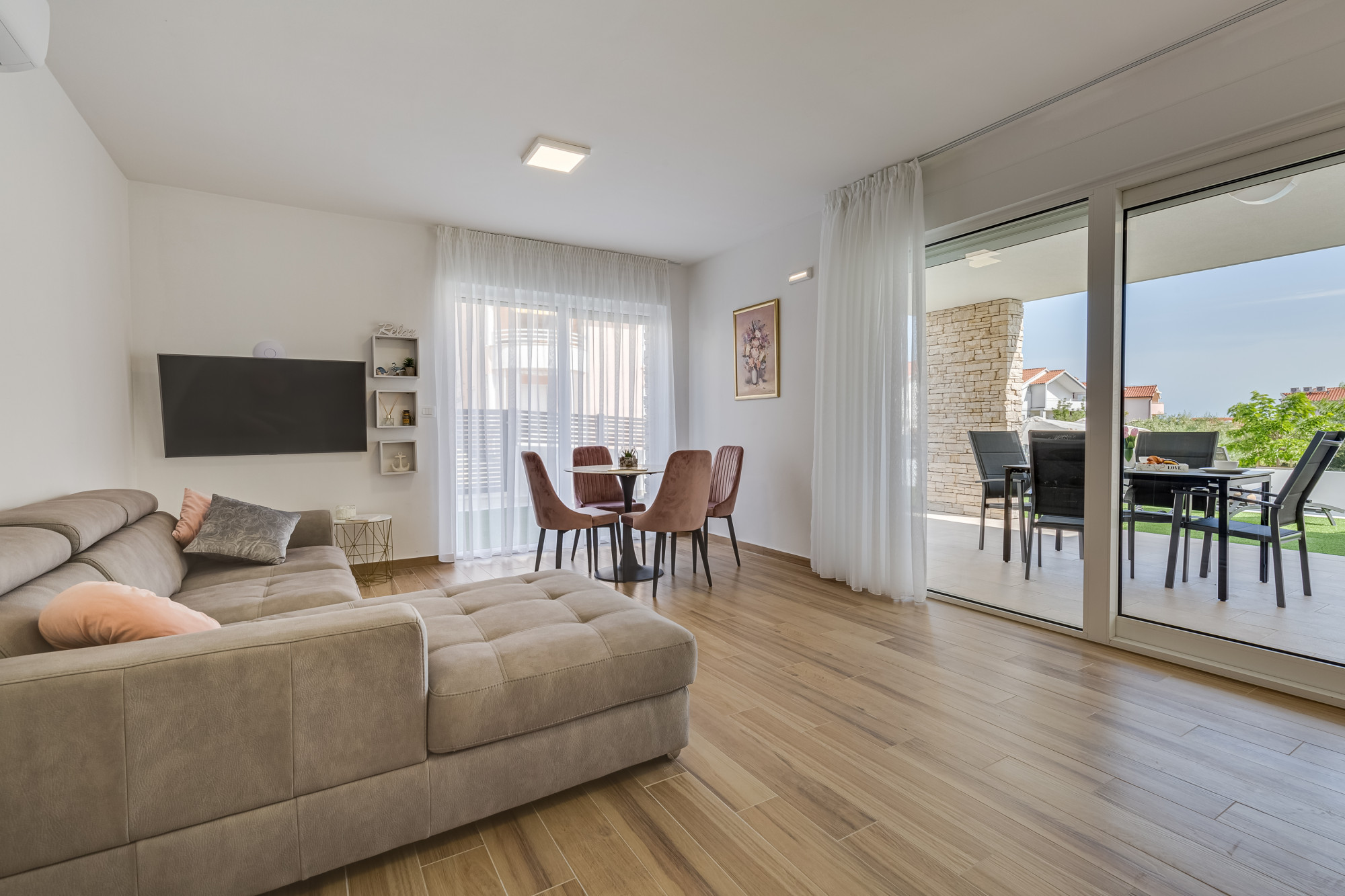 U ovom apartmanu koji se nalazi u prizemlju veličine 60 m2 uživajte u pogledu na bazen i vrt. Prima 4 gosta.